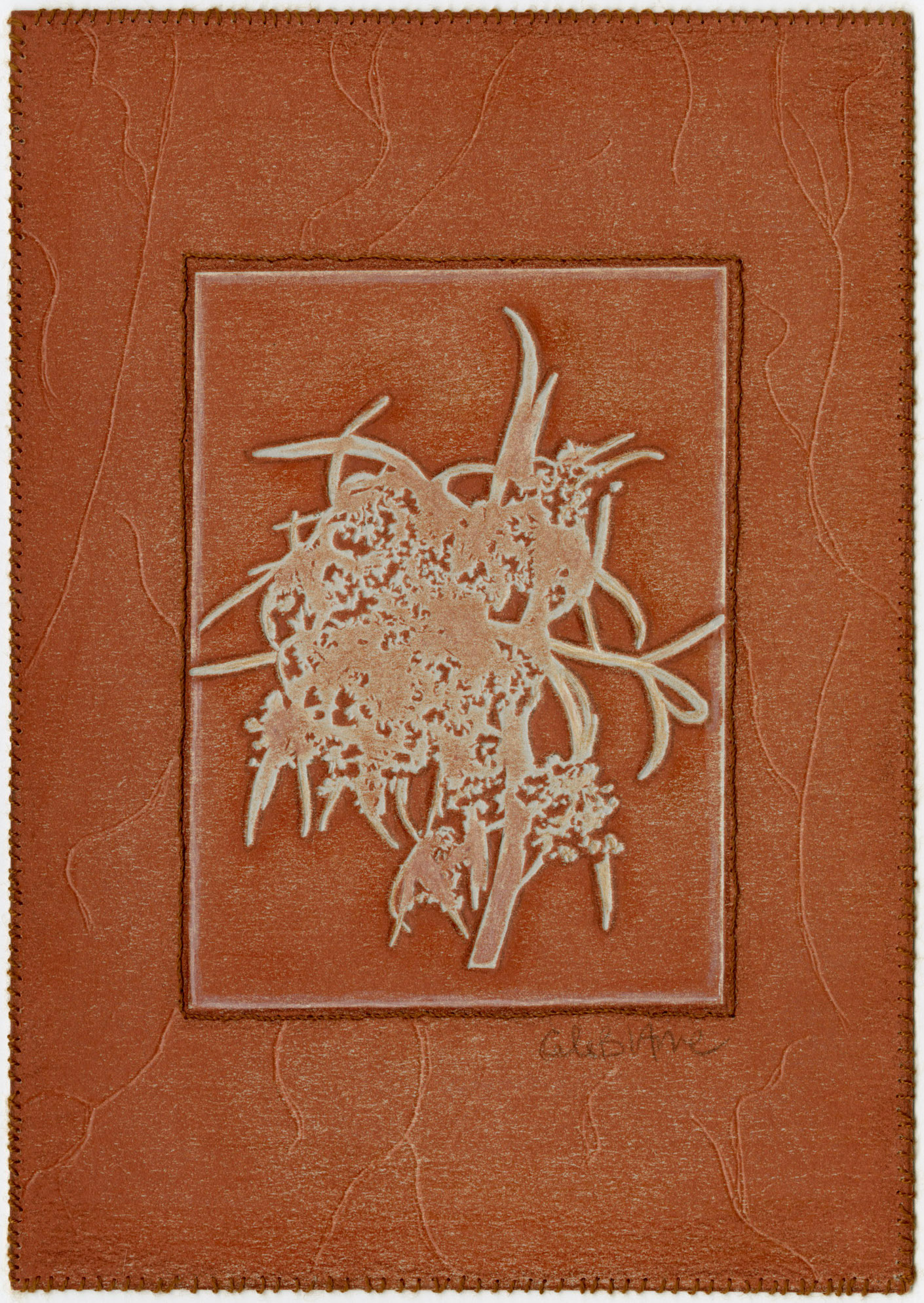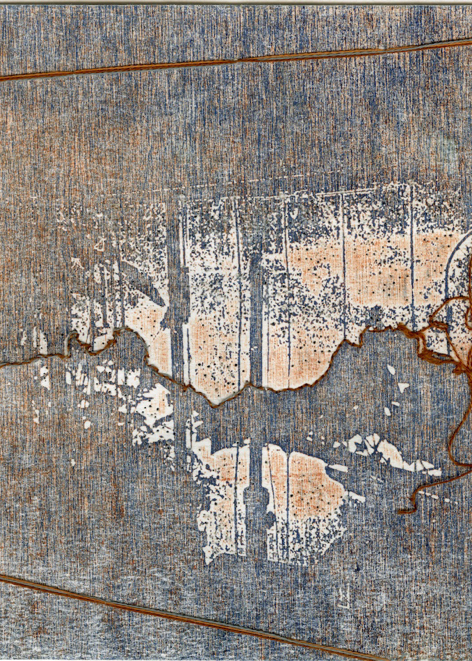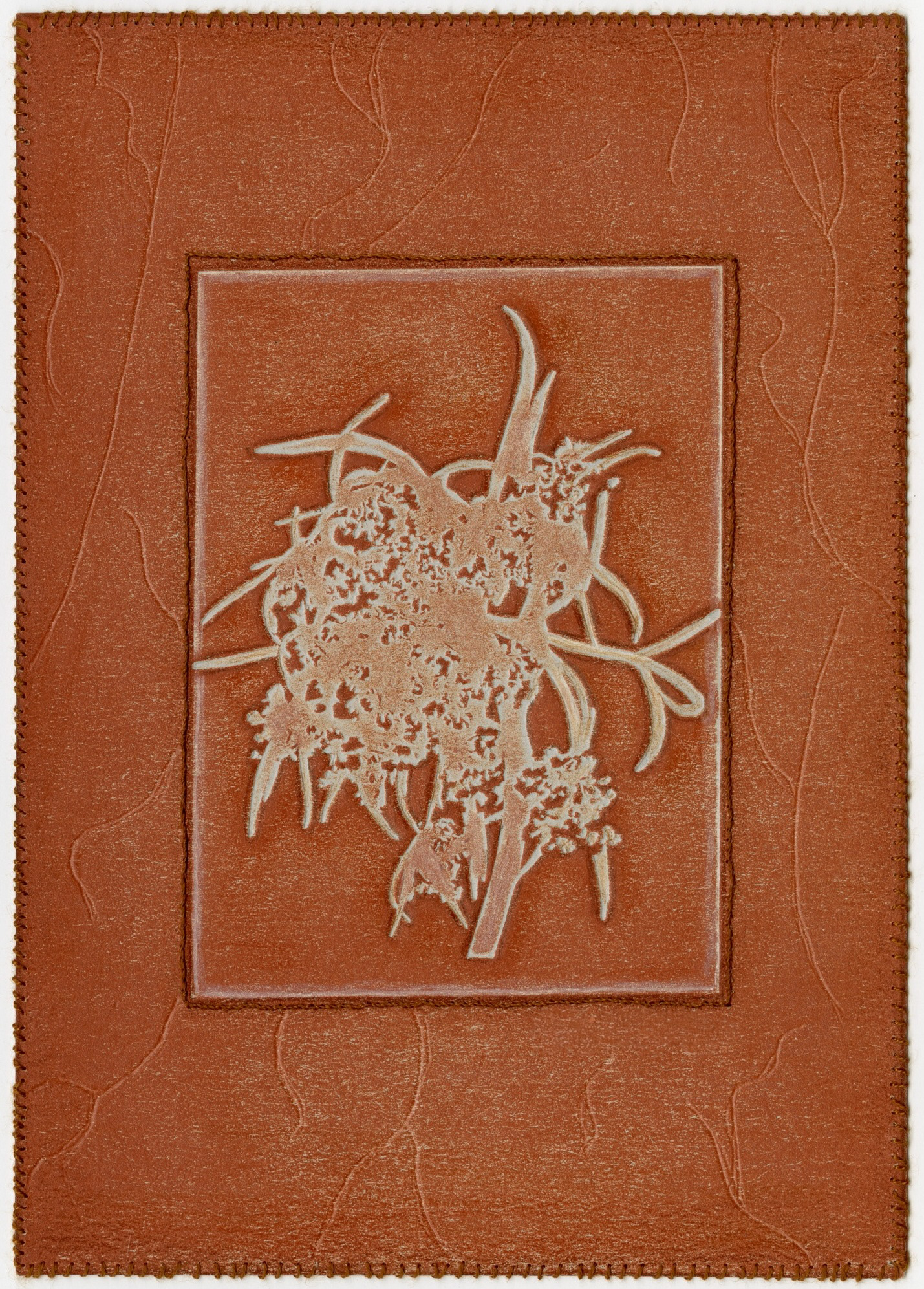 Technique mixte : Gaufrage avec plaque photopolymère, encre, crayons de couleur et broderie