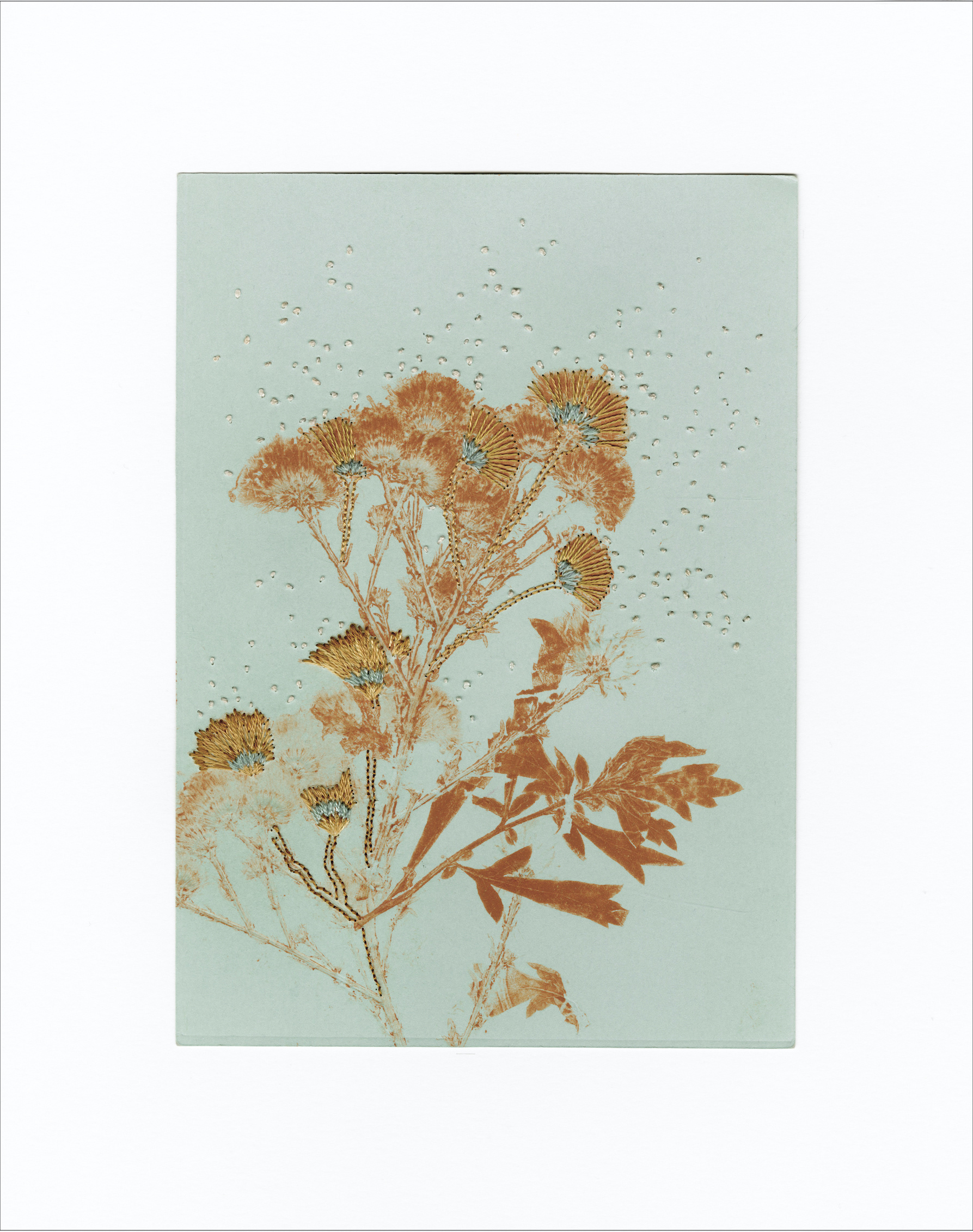 Relief printing enhanced with embroidery, pasted on a cream white paper