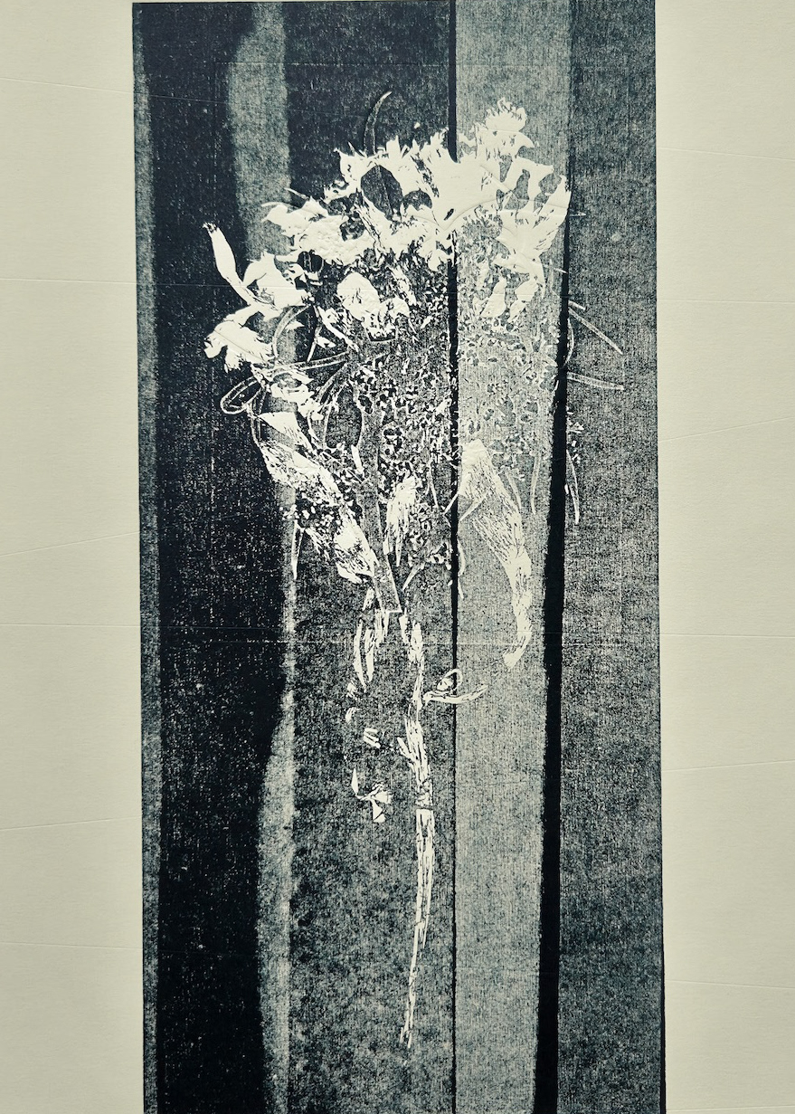 Impression en relief, broderie et perforations, collée sur un papier blanc